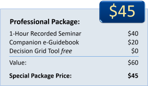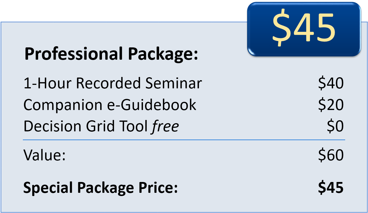 Our Illness Warriors Professional Package includes the exclusive 1-Hour Professional Seminar, the companion e-Guidebook and the Decision Grid Tool.